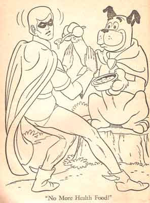 The story starts out rather innocently with the Superfriends working out in the park. You get pages like "walking is healthy" and shots of Marvin working out with dumbells. Then you get this scene of Robin getting grossed out by health food followed up by Wendy and Marvin hiding the health food in a bush (!)