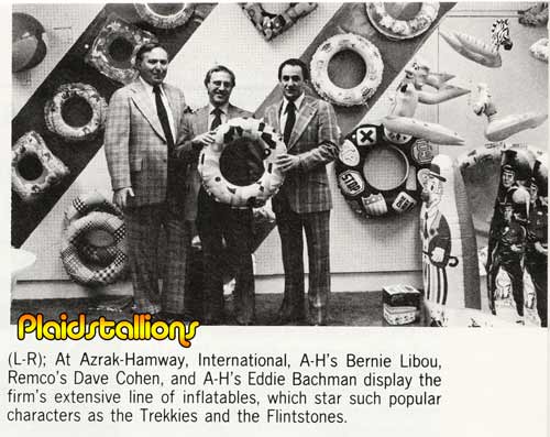 A shot of the 1976 Azrak Hamway booth shows the two different sizes of Mr. Spock Bop Bags. It's funny to read an article where the person has no idea what Star Trek is...