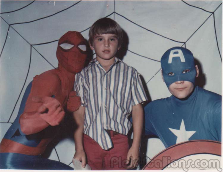 The setting is the 1974 Michigan state fair, the boy is unknown, the photo only states he's 9 years old. Lynch tells me that the Cap suit is a rental from Marvel (I wonder if this is the same Cap I saw at Woolco in '75) but Spider-man's outfit is there courtesy of Hallmark coins.